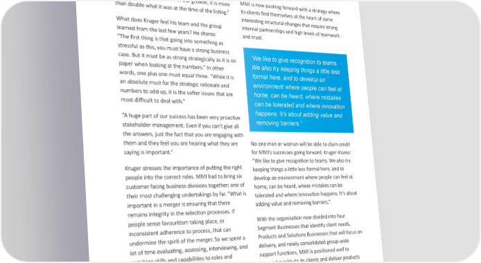 “One of the objectives of the merger between When I asked Kruger about how he dealt with Metropolitan and Momentum in 2010 was to save creating a holding company team and board, trust ZAR500 million in costs, and that we accomplish this was at the centre of it all. “During the negotiation ahead of schedule. We’ve been able to merge six phase of the merger we would on occasion find different product businesses, while retaining an ourselves across the table from each other as extremely high percentage of senior management. adversaries. The quickest way to trust each other There is always concern over client retention during was to trust one another’s intent. If you trust the something like this, but our numbers remained other party’s intent, you can still move forward.” solid, and if we use our MMI share price plus dividends as an indication of our growth, it is more MMI is now pushing forward with a strategy where than double what it was at the time of the listing.” its clients find themselves at the heart of some interesting structural changes that require strong What does Kruger feel his team and the group internal partnerships and high levels of teamwork learned from the last few years? He shares: and trust. “The first thing is that going into something as stressful as this, you must have a strong business “We like to give recognition to teams. case. But it must be as strong strategically as it is on We also try keeping things a little less paper when looking at the numbers.” In other words, one plus one must equal three. “While it is formal here, and to develop an an absolute must for the strategic rationale and environment where people can feel at numbers to add up, it is the softer issues that are home, can be heard, where mistakes most difficult to deal with.” can be tolerated and where innovation “A huge part of our success has been very proactive happens. It’s about adding value and stakeholder management. Even if you can’t give all removing barriers.” the answers, just the fact that you are engaging with them and they feel you are hearing what they are No one man or woman will be able to claim credit saying is important.” for MMI’s successes going forward. Kruger shares: “We like to give recognition to teams. We also try Kruger stresses the importance of putting the right keeping things a little less formal here, and to people into the correct roles. MMI had to bring six develop an environment where people can feel at customer facing business divisions together; one of home, can be heard, where mistakes can be their most challenging undertakings by far. “What is tolerated and where innovation happens. It’s about important in a merger is ensuring that there adding value and removing barriers.” remains integrity in the selection processes. If people sense favouritism taking place, or With the organisation now divided into four inconsistent adherence to process, that can Segment Businesses that identify client needs, undermine the spirit of the merger. So we spent a Products and Solutions Businesses that will focus on lot of time evaluating, assessing, interviewing, and delivery, and newly consolidated group-wide matching skills and capabilities to roles and support functions, MMI is positioned well to functions.” respond quickly to its clients and deliver products that supply their needs and solve their problems. As important as skills and capabilities are, the aspirations of the soon to be appointed executives Time will tell whether or not Kruger and his team need to be understood as well. Fallout is another have made the correct decision to restructure this essential risk to manage, says Kruger: “As important organisation, but with high staff morale and low as it is to choose the right person, it is also very attrition rates, a solid and loyal customer base, and necessary to have a process in place for those not strong leadership with a clear sense of where they chosen. They are still very valuable and you must do are headed, it seems that MMI may be worth having all you can to retain them in other appropriate in one’s investment portfolio. roles.” 5