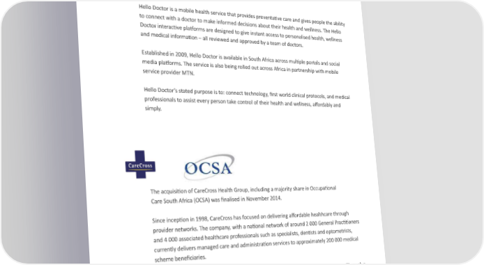 hello doctor Hello Doctor is a mobile health service that provides preventative care and gives people the ability to connect with a doctor to make informed decisions about their health and wellness. The Hello Doctor interactive platforms are designed to give instant access to personalised health, wellness and medical information – all reviewed and approved by a team of doctors. Established in 2009, Hello Doctor is available in South Africa across multiple portals and social media platforms. The service is also being rolled out across Africa in partnership with mobile service provider MTN. Hello Doctor’s stated purpose is to: connect technology, first world clinical protocols, and medical professionals to assist every person take control of their health and wellness, affordably and simply. The acquisition of CareCross Health Group, including a majority share in Occupational Care South Africa (OCSA) was finalised in November 2014. Since inception in 1998, CareCross has focused on delivering affordable healthcare through provider networks. The company, with a national network of around 2 000 General Practitioners and 4 000 associated healthcare professionals such as specialists, dentists and optometrists, currently delivers managed care and administration services to approximately 200 000 medical scheme beneficiaries. OCSA is widely considered a market leader in workplace health and wellness solutions. Through a joint initiative with OCSA, CareCross delivers integrated occupational health solutions to approximately 55 000 workers nationally. The acquisition of CareCross extends the ability of MMI and its Health Solutions business to offer holistic solutions to existing and prospective clients, reinforcing MMI’s commitment to client centricity. 21
