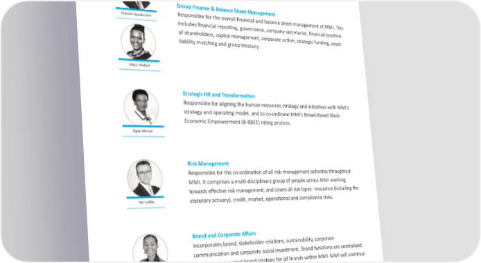 Products and Solutions business Designs solutions to meet the financial wellness needs of clients identified by the segment businesses. It was created to establish a single investment capability within the group to align with our outcomes-based investment philosophy. Etienne de Waal Group Finance & Balance Sheet Management Preston Speckmann Responsible for the overall financial and balance sheet management of MMI. This includes financial reporting, governance, company secretariat, financial position of shareholders, capital management, corporate action, strategic funding, asset- liability matching and group treasury. Mary Vilakazi Strategic HR and Transformation Responsible for aligning the human resources strategy and initiatives with MMI’s strategy and operating model, and to co-ordinate MMI’s Broad-Based Black Economic Empowerment (B-BBEE) rating process. Ngao Motsei Risk Management Responsible for the co-ordination of all risk management activities throughout MMI. It comprises a multi-disciplinary group of people across MMI working towards effective risk management, and covers all risk types - insurance (including the Jan Lubbe statutory actuary), credit, market, operational and compliance risks. Brand and Corporate Affairs Incorporates brand, stakeholder relations, sustainability, corporate communication and corporate social investment. Brand functions are centralised for a more integrated brand strategy for all brands within MMI. MMI will continue Vuyo Lee to leverage MMI’s strong client-facing brands, including new additions to our portfolio of brands. Group Infrastructure and Operations Responsible for steering MMI’s new operating model, the division is also responsible for ensuring a secure, sustainable and relevant infrastructure and technology environment that enables the business to achieve its goals. Danie Botes 17