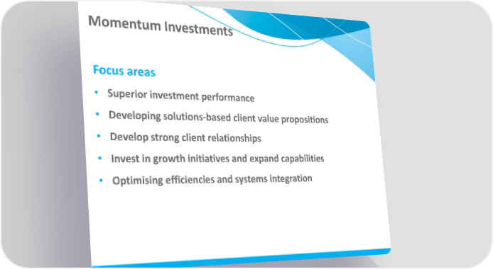 Momentum Investments Focus areas • Superior investment performance • Developing solutions-based client value propositions • Develop strong client relationships • Invest in growth initiatives and expand capabilities • Optimising efficiencies and systems integration