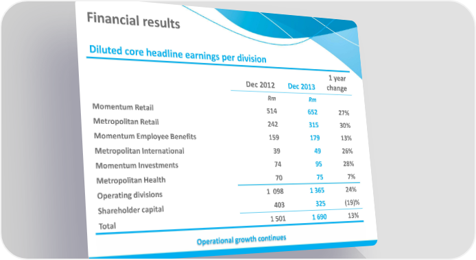 Financial results Diluted core headline earnings per division 1 year Dec 2012 Dec 2013 change Rm Rm Momentum Retail 514 652 27% Metropolitan Retail 242 315 30% Momentum Employee Benefits 159 179 13% Metropolitan International 39 49 26% Momentum Investments 74 95 28% Metropolitan Health 70 75 7% Operating divisions 1 098 1 365 24% Shareholder capital 403 325 (19)% Total 1 501 1 690 13% Operational growth continues
