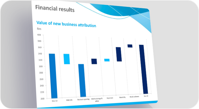 Financial results Value of new business attribution Rm 400 380 360 340 320 300 280 260 240 220 200 Dec-12 FNB Life Revised opening Methodology & Expenses Mortality Mix & volumes Dec-13 other
