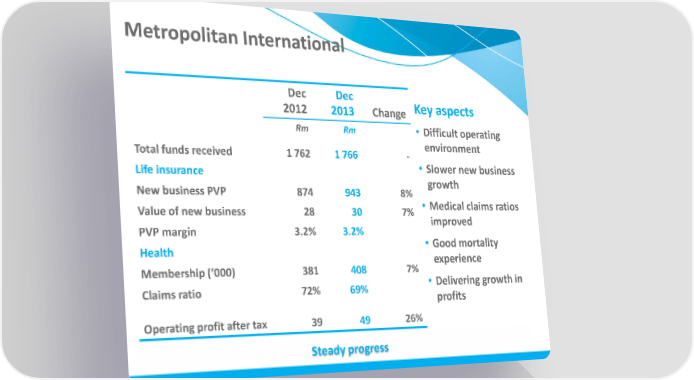 Metropolitan International Dec Dec Key aspects 2012 2013 Change Rm Rm • Difficult operating Total funds received 1 762 1 766 - environment Life insurance • Slower new business New business PVP 874 943 8% growth Value of new business 28 30 7% • Medical claims ratios PVP margin 3.2% 3.2% improved Health • Good mortality Membership (‘000) 381 408 7% experience Claims ratio 72% 69% • Delivering growth in profits Operating profit after tax 39 49 26% Steady progress