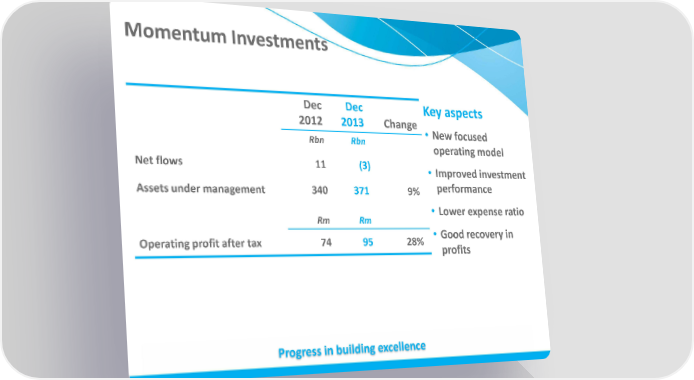 Momentum Investments Dec Dec Key aspects 2012 2013 Change • New focused Rbn Rbn operating model Net flows 11 (3) • Improved investment Assets under management 340 371 9% performance Rm Rm • Lower expense ratio Operating profit after tax 74 95 28% • Good recovery in profits Progress in building excellence