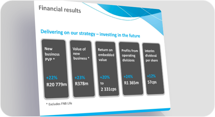 Financial results Delivering on our strategy – investing in the future New Value of Return on Profits from Interim business new embedded operating dividend PVP * business * value divisions per share +22% +23% +20% +24% +12% R20 779m R378m to R1 365m 57cps 2 331cps * Excludes FNB Life