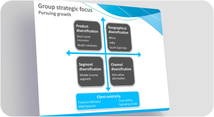 Group strategic focus Pursuing growth Product Geographical diversification diversification Short-term Africa insurance India Health solutions South-East Asia Segment Channel diversification diversification Middle income Alternative segment distribution Client-centricity Financial Wellness Cross-selling MMI Rewards Operating model