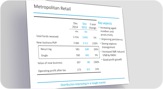 Metropolitan Retail Dec Dec 1 year Key aspects 2014 2015 change • Increasing agent Rm Rm numbers and productivity Total funds received 3 456 3 645 5% • Improving persistency New business PVP 2 684 2 411 (10)% • Strong expense Recurring 581 530 (9)% management • Increased RdR reduced Single 590 641 9% VNB by R40m Value of new business 107 68 (36)% • Good profit growth Operating profit after tax 273 311 14% Distribution improving in a tough market
