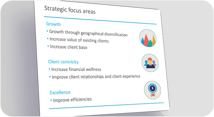 Strategic focus areas Growth • Growth through geographical diversification • Increase value of existing clients • Increase client base Client centricity • Increase financial wellness • Improve client relationships and client experience Excellence • Improve efficiencies