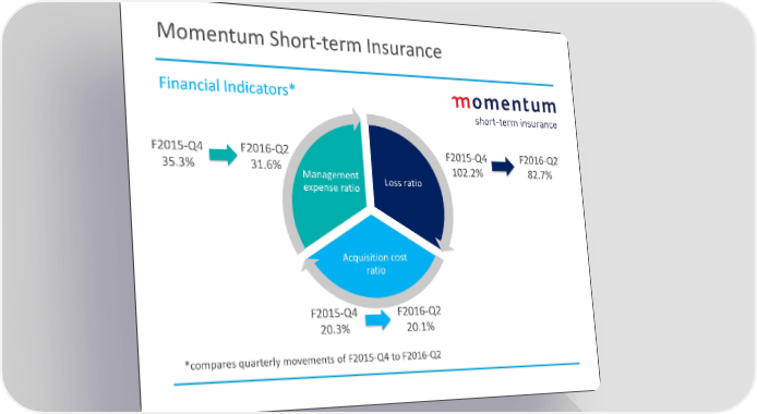 Momentum Short-term Insurance Financial Indicators* F2015-Q4 F2016-Q2 F2015-Q4 F2016-Q2 35.3% 31.6% Management 102.2% 82.7% expense ratio Loss ratio Acquisition cost ratio F2015-Q4 F2016-Q2 20.3% 20.1% *compares quarterly movements of F2015-Q4 to F2016-Q2
