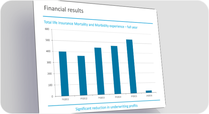 Financial results Total life insurance Mortality and Morbidity experience – full year 600 500 400 300 200 100 0 FY2011 FY2012 FY2013 FY2014 FY2015 1H2016 Significant reduction in underwriting profits