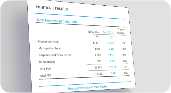 Financial results New business per segment 1 year Dec 2014 Dec 2015 change Rm Rm Momentum Retail 11 817 12 673 7% Metropolitan Retail 2 684 2 411 (10)% Corporate and Public Sector 8 369 10 921 30% International 975 1 265 30% Total PVP 23 845 27 270 14% Total APE 3 126 3 473 11% Strong growth in a difficult market