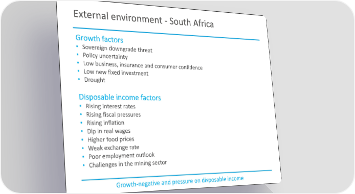 External environment - South Africa Growth factors • Sovereign downgrade threat • Policy uncertainty • Low business, insurance and consumer confidence • Low new fixed investment • Drought Disposable income factors • Rising interest rates • Rising fiscal pressures • Rising inflation • Dip in real wages • Higher food prices • Weak exchange rate • Poor employment outlook • Challenges in the mining sector Growth-negative and pressure on disposable income