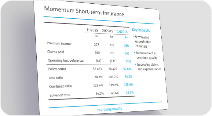 Momentum Short-term Insurance 1H2015 2H2015 1H2016 Key aspects Rm Rm Rm • Terminated unprofitable Premium income 227 279 286 channels Claims paid 160 281 245 • Improvement in premium quality Operating loss before tax (51) (131) (95) • Improving claims Policy count 53 483 56 425 52 634 and expense ratios Loss ratio 70.4% 100.7% 85.7% Combined ratio 128.4% 149.8% 135.6% Solvency ratio 34.0% 43.6% 33.9% Improving quality