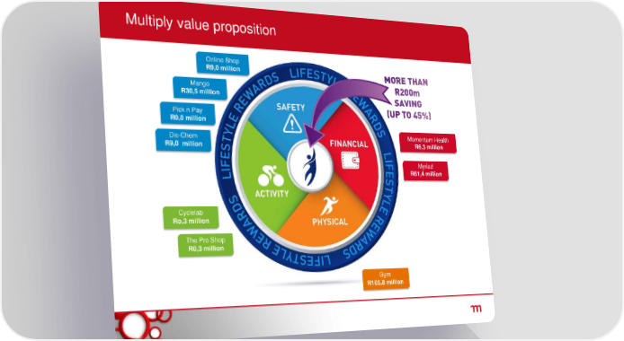 Multiply value proposition Online Shop R9,0 million Mango R30,5 million Pick n Pay R0,8 million Dis-Chem Momentum Health R9,0 million R6,3 million Myriad R61,4 million Cyclelab Ro,3 million The Pro Shop R0,3 million Gym R105,8 million
