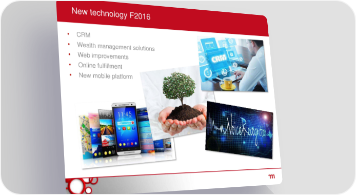 New technology F2016 • CRM • Wealth management solutions • Web improvements • Online fulfillment • New mobile platform
