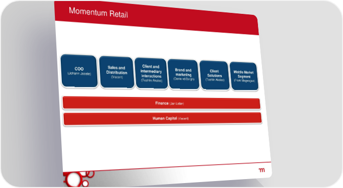 Momentum Retail Sales and Client and Brand and Client Middle Market COO Distribution intermediary marketing Solutions Segment (Johann Jooste) (Vacant) interactions (Danie vd Bergh) (Teshlin Akaloo) (Frank Magwegwe) (Teshlin Akaloo) Finance (Jan Lotter) Human Capital (Vacant)