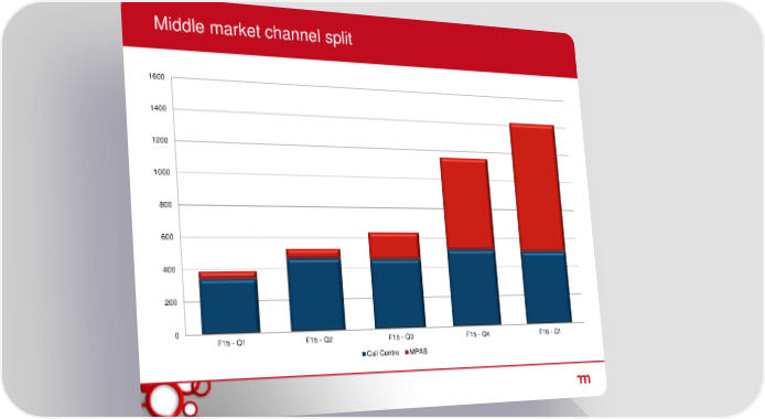 Middle market channel split 1600 1400 1200 1000 800 600 400 200 0 F15 - Q1 F15 - Q2 F15 - Q3 F15 - Q4 F16 - Q1 Call Centre MPAS